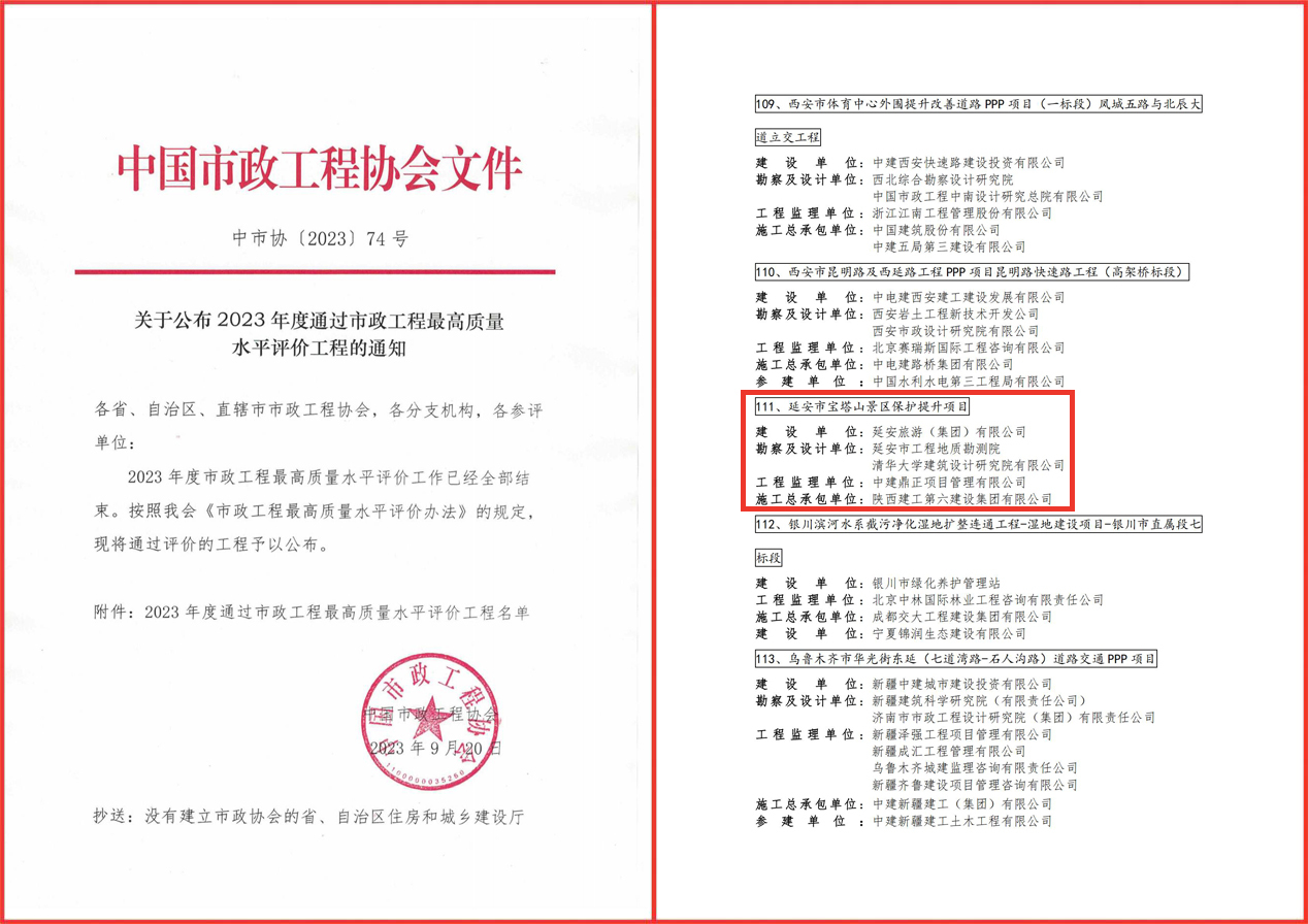近日,中國市政工程協(xié)會發(fā)布2023年度市政工程最高質(zhì)量水平評價工程獲獎名單,由集團公司承建的延安寶塔山景區(qū)保護提升工程項目榜上有名。
