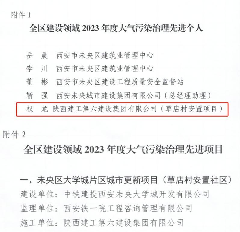 近日,西安市未央?yún)^(qū)住房和城市建設(shè)局發(fā)布了《關(guān)于表彰全區(qū)建設(shè)領(lǐng)域2023年度大氣污染治理先進(jìn)典型的通報(bào)》,由陜建六建集團(tuán)第五建筑工程公司承建的未央?yún)^(qū)草店村社區(qū)建設(shè)項(xiàng)目被評(píng)為全區(qū)建設(shè)領(lǐng)域2023年度大氣污染治理先進(jìn)項(xiàng)目,項(xiàng)目經(jīng)理權(quán)龍被評(píng)為全區(qū)建設(shè)領(lǐng)域2023年度大氣污染治理先進(jìn)個(gè)人。